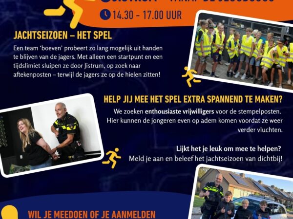 Een team ‘boeven’ probeert zo lang mogelijk uit handen te blijven van de jagers. Met alleen een startpunt en een tijdslimiet sluipen ze door Jistrum, op zoek naar aftekenposten – terwijl de jagers ze op de hielen zitten!
